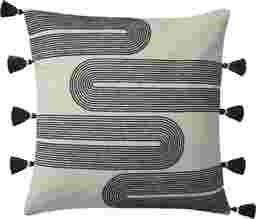 Modern and playful, the black-and-white Boheme throw pillow features embroidered arch designs trimmed with tassels. This versatile accent measures 22" x 22", a standard size to style in living rooms and bedrooms.