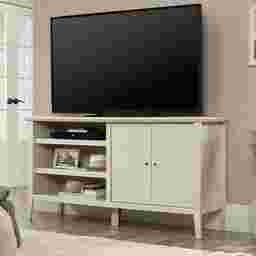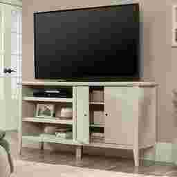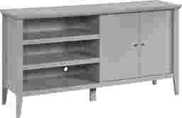 The Bohrer gray console accommodates up to a 65-inch TV weighing 70 pounds or less. Hidden storage behind doors includes two adjustable shelves. Two other adjustable shelves can hold audio/video equipment. The top surface and door fronts feature a decorative hexagon pattern. The Bohrer has an enclosed back panel with cord access. This console has quick and easy assembly with slide-on moldings. Customer assembly is required.