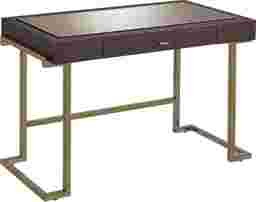 Simple and stunning, the Boice espresso desk speaks of modern design with the use of a simple champagne metal base that supports the espresso polyurethane wrapped desk top box. The desk features a middle drawer and a top surface with an inset smoky mirror to create an outstanding desk for both use and display. It will create a perfect work space in your home office or bedroom. Some customer assembly required.