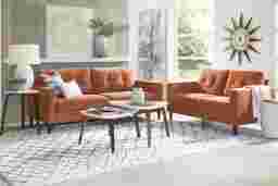Style your living room with the contemporary looks of the Bonavista living room. Featuring sleek track arms and tufted backs, this collection brings a modern style to your space that adds life thanks to the beautiful orange color of the upholstery. Tapered wooden legs finish the minimal look of this collection. This room comes complete with a matching sofa and loveseat. Upholstery: 100% Polyester. Cleaning Instructions: Use water based cleaning agents or foam. Accent pillows not included. Partial customer assembly required.