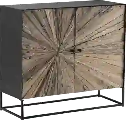 The Bonifield brown accent cabinet has a black metal casing and box stand that highlights the offset starburst pattern of the two-light wood doors. With the character of old barn wood, this rough and rustic cabinet manifests the wear and charm of aged wood. The wedges of wood laid together form a burst from the first door that carries through to the second door. The small, black door pulls are large enough to know they are there but are not a distraction from the beauty of the design. The cabinet is large enough to store all your entertainment needs in a dining area or breakfast nook.