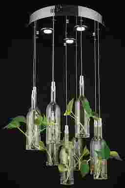 Promote your love for nature and illuminate your interior space with the unique Botanical chandelier. Displays nine glass bottles with attached leaves to give an earthy feel with its brilliant appearance. To clean, make sure the chandelier is off and cool first, then dust with a soft rag. Requires 12 bulbs, 9 LED with a max of 1W, and 3 of GUI10 with a max of 35W. Bulbs not included. Make sure Chandelier is off and cool and dust with soft rag. Assembly required.