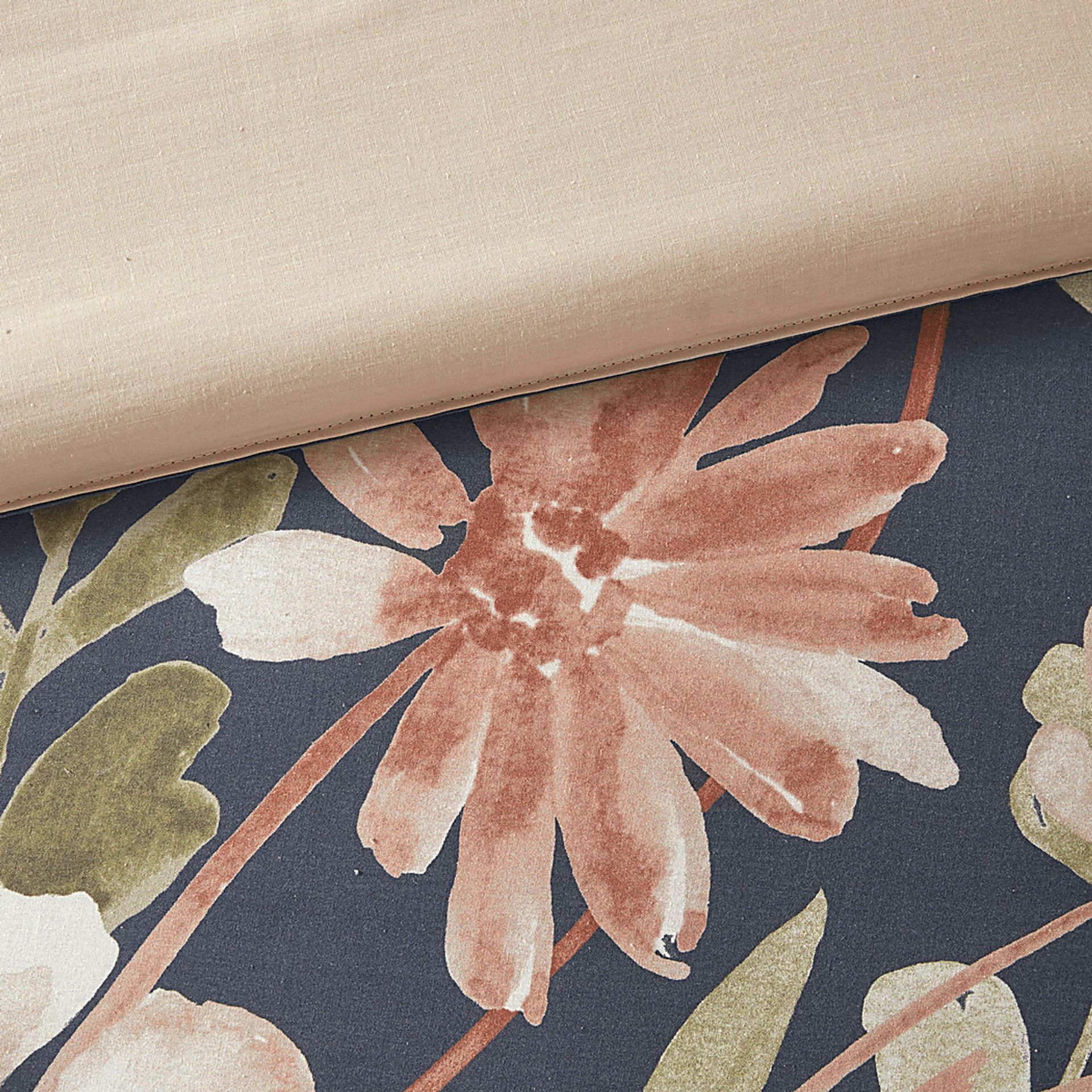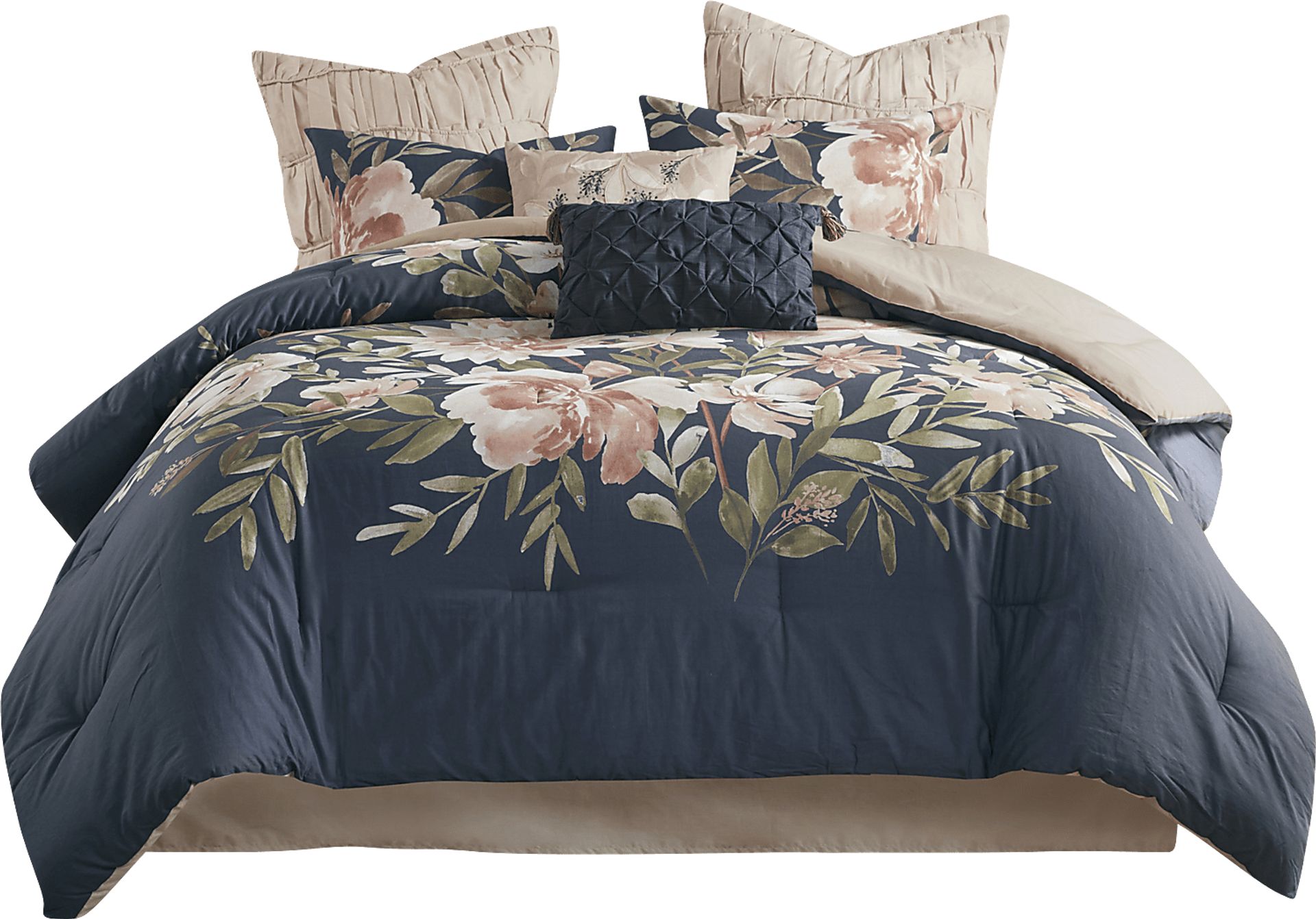 Bring beauty and graceful style to your bedroom with the Bottlebrush navy 8 Pc comforter set. The navy comforter and 2 matching shams feature a large blush floral print to create a stunning shabby chic look. A solid blush reverse adds a soft touch of color to contrast the face of the comforter. The 2 blush Euro shams flaunt a ruffled texture that adds dimension to the bed, while 2 decorative pillows and a solid bed skirt provide the finishing touches. Items in the set may come in a rolled or compressed packaging, which will need to be fluffed up or steam ironed before use to remove wrinkles.