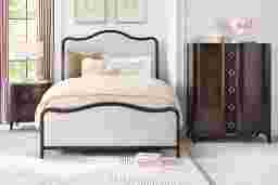 Filling space like the calming, effortless flow of a beautifully composed melody, the Bradbury bedroom transforms your room into a sanctuary of modern sophistication with its elegant curves and refined details. Crafted with cherry veneers in a rich brown finish, this contemporary collection features a gray upholstered bed with a wavy wooden frame, creating a soft yet fortified silhouette. The chest showcases a square frame and wavy drawer fronts with circular metal pulls in a silver rope-textured finish for a striking design element. Made with front and back English dovetail joints for enhanced durability, the drawers feature under-mount glides for a premium opening and closing experience. An accent nightstand offers a graceful balance with its distinctive oval-shaped frame and tapered legs. The matching circular mirror with beveled wooden frame reflects both style and light, bringing depth and cohesion to your space. Mattress and foundation (if required) sold separately. Bed shown is queen size.