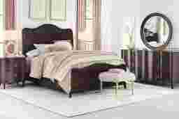 Filling space like the calming, effortless flow of a beautifully composed melody, the Bradbury bedroom transforms your room into a sanctuary of modern sophistication with its elegant curves and refined details. Crafted with cherry veneers in a rich brown finish, this contemporary collection features a panel headboard and footboard with a wavy frame, creating a soft yet fortified silhouette. The chest showcases a square frame and wavy drawer fronts with circular metal pulls in a silver rope-textured finish for a striking design element. Made with front and back English dovetail joints for enhanced durability, the drawers feature under-mount glides for a premium opening and closing experience. An accent nightstand offers a graceful balance with its distinctive oval-shaped frame and tapered legs. The matching circular mirror with beveled wooden frame reflects both style and light, bringing depth and cohesion to your space. Mattress and foundation (if required) sold separately. Bed shown is queen size.
