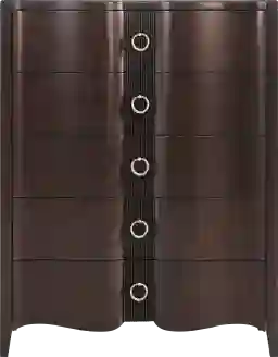 This piece features a sophisticated contemporary aesthetic, defined by unique wavy drawer fronts that add a sense of movement and texture to your room. The drawers are accented with circular metal pulls finished in a silver rope texture. These silver-finished knobs provide a striking contrast against the dark brown cherry finish, offering a tactile and high-end feel that establishes the chest as a focal point in any modern bedroom suite.