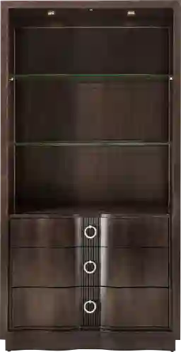 It offers a versatile mix of open display and hidden storage. You have glass shelving for showcasing items and three unique wavy-front drawers at the base. These drawers feature stylish silver rope-textured pulls and are ideal for storing linens, silver, or smaller dining accessories that you prefer to keep organized and out of sight.