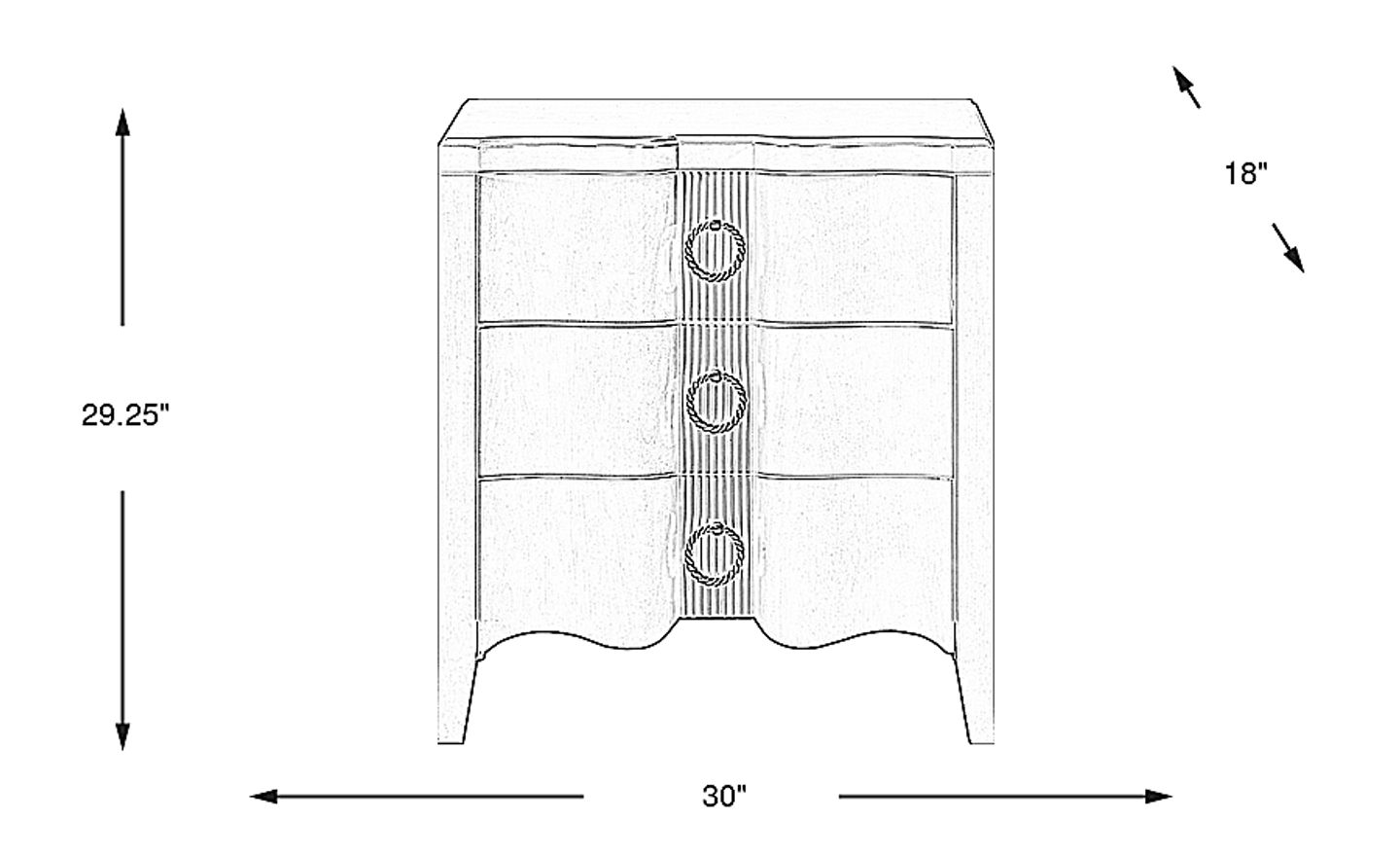 Filling space like the calming, effortless flow of a beautifully composed melody, the Bradbury nightstand transforms your room into a sanctuary of modern sophistication with its elegant curves and refined details. Crafted with cherry veneers in a rich brown finish, this contemporary piece features a square frame and delightful tapered legs. The wavy drawer fronts with circular metal pulls in a silver rope-textured finish add a striking design element, while the front and back English dovetail joints accompanied by under-mount glides makes all three drawers function with ease and durability. USB ports mounted to the back offer convenient overnight charging for your devices.