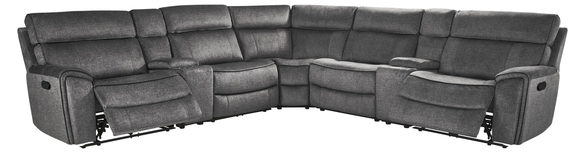 The sleek design and soothing feel of the Bradshaw Place living room brings harmony and balance to endless nights of intimate, relaxed gatherings. Traditional in style, this sectional features soft, padded arms and attached seat cushions for a luxurious touch. Contrast welting draws the perfect amount of attention to the smooth dark gray upholstery while delivering casual sophistication. A storage compartment and stainless steel cupholders in the console are the ultimate finishing touch, providing easy access to all your relaxation essentials. Upholstery: 100% Polyester.