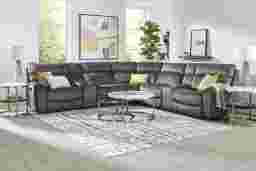 The sleek design and soothing feel of the Bradshaw Place living room brings harmony and balance to endless nights of intimate, relaxed gatherings. Traditional in style, this sectional features soft, padded arms and attached seat cushions for a luxurious touch. Contrast welting draws the perfect amount of attention to the smooth dark gray upholstery while delivering casual sophistication. A storage compartment and stainless steel cupholders in the console are the ultimate finishing touch, providing easy access to all your relaxation essentials. Upholstery: 100% Polyester.