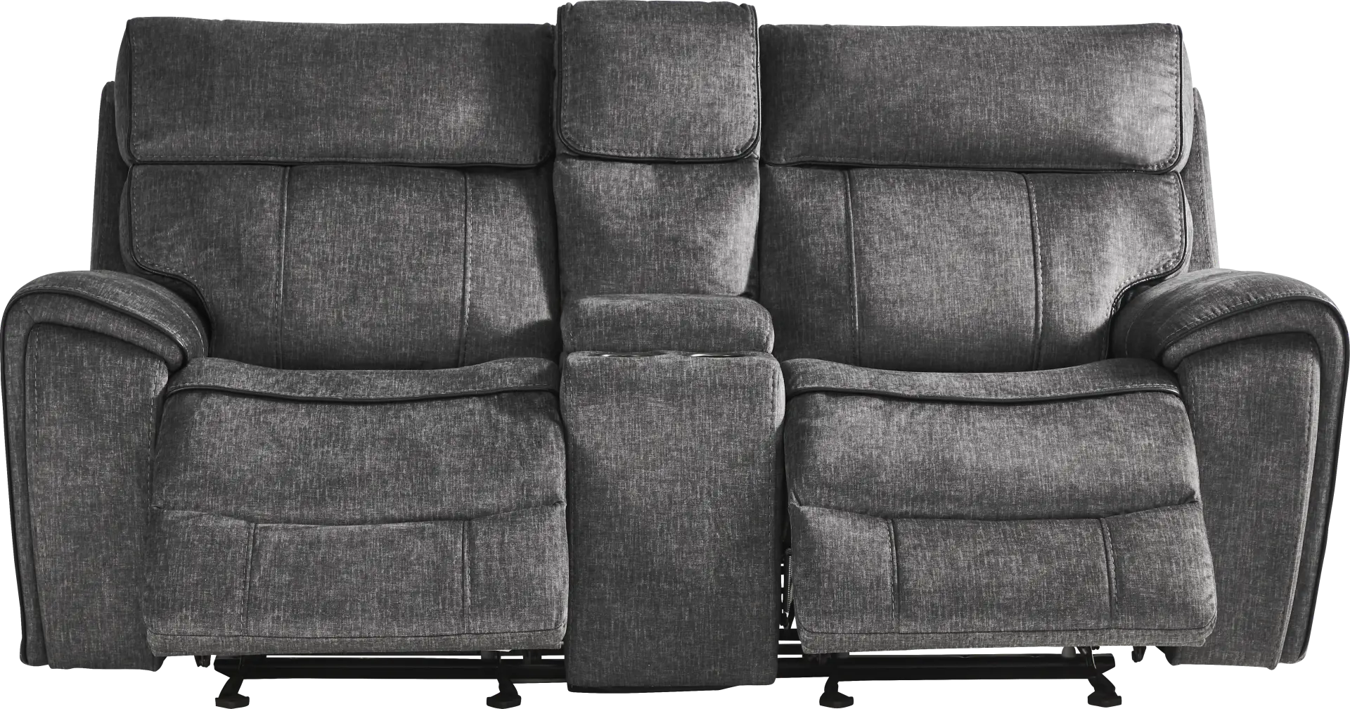 The sleek design and soothing feel of the Bradshaw Place loveseat brings harmony and balance to endless nights of intimate, relaxed gatherings. Traditional in style, this piece features soft, padded arms and attached seat cushions for a luxurious touch. Contrast welting draws the perfect amount of attention to the smooth dark gray upholstery while delivering casual sophistication, while a reclining mechanism allows personal adjustment to the footrest for optimal comfort. The calming gliding motion offers an additional way to relax. A storage console with stainless steel cupholders is the ultimate finishing touch, providing easy access to all your relaxation essentials. Upholstery: 100% Polyester.