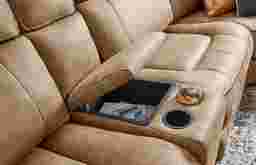 The sleek design and soothing feel of the Bradshaw Place living room brings harmony and balance to endless nights of intimate, relaxed gatherings. Traditional in style, this sectional features soft, padded arms and attached seat cushions for a luxurious touch. Contrast welting draws the perfect amount of attention to the smooth stone-beige upholstery. Dual power reclining allows personal adjustment to the head and footrest for optimal comfort, while the chaise offers power reclining for effortless adjustment to the footrest. A storage console with stainless steel cupholders is the ultimate finishing touch, providing easy access to all your relaxation essentials. Upholstery: 100% polyester.