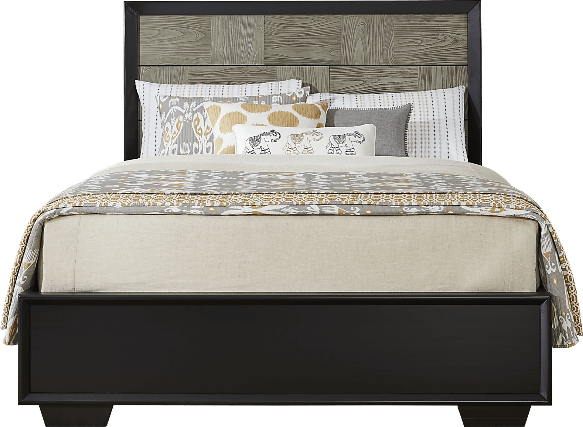 Influenced by rustic and contemporary styles, the Braedin bed creates a sleek, serene haven for your bedroom. Crafted of pine and wood solids, this panel-style bed comes in a black finish. Adding a unique touch, the headboard features a wood grain pattern in a contrasting off-white finish. Its authentic, natural wood look grants an earthy appeal. Mattress and foundation (if required) sold separately. Bed shown is queen size.