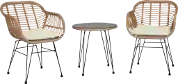 Absolutely. This chat set is specifically designed for intimate alcoves and compact urban spaces. With individual chair dimensions of approximately 22.5"W x 24"D, it provides a sophisticated "boho-chic" look without overwhelming limited square footage. The open-back design and slim splayed legs create a visual "airy" feel that helps smaller balconies or sunrooms appear more open and less cluttered.