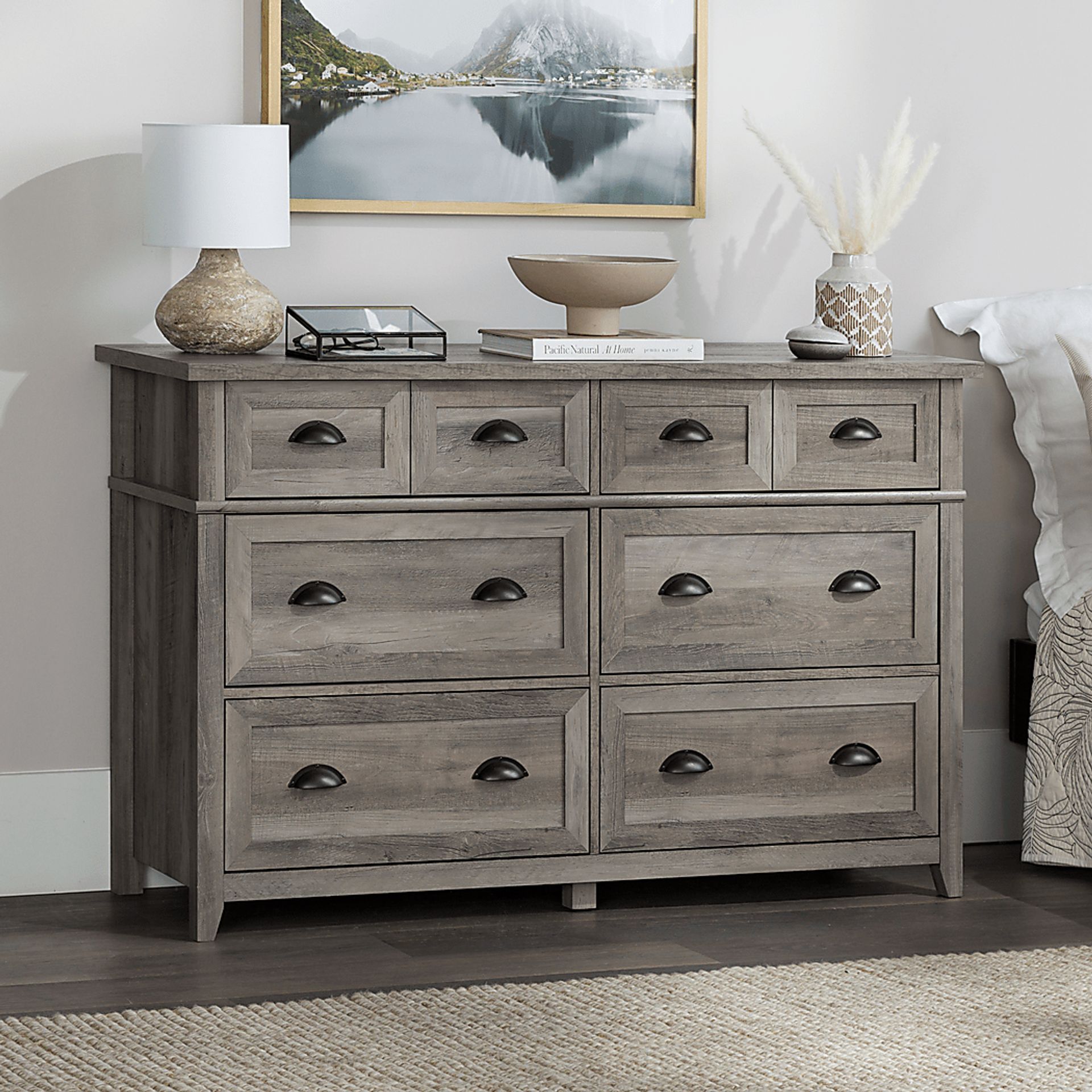 Expand your bedroom storage potential with this hardy chest of drawers. An organizational dream, this Bramwyck dresser features six drawers on telescoping metal glides, providing you with an abundance of space for clothes, linens, or accessories. The two single top drawers each feature faux double drawer faces to add visual variety without sacrificing storage space. Framed drawer faces and cup handles convey a dash of transitional farmhouse style that makes any bedroom feel cozier. Customer assembly is required.