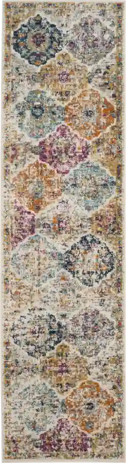 The distressed finish and rich color palette—featuring cream, blue, orange, and wine—allow this rug to ground both Boho and Rustic interiors. The mosaic pattern adds a sophisticated, global-inspired element, while the intentionally weathered look provides a lived-in character that complements natural wood finishes and eclectic home accents. It is a versatile piece for adding warmth and visual interest to a transitional space or an urban apartment hallway.