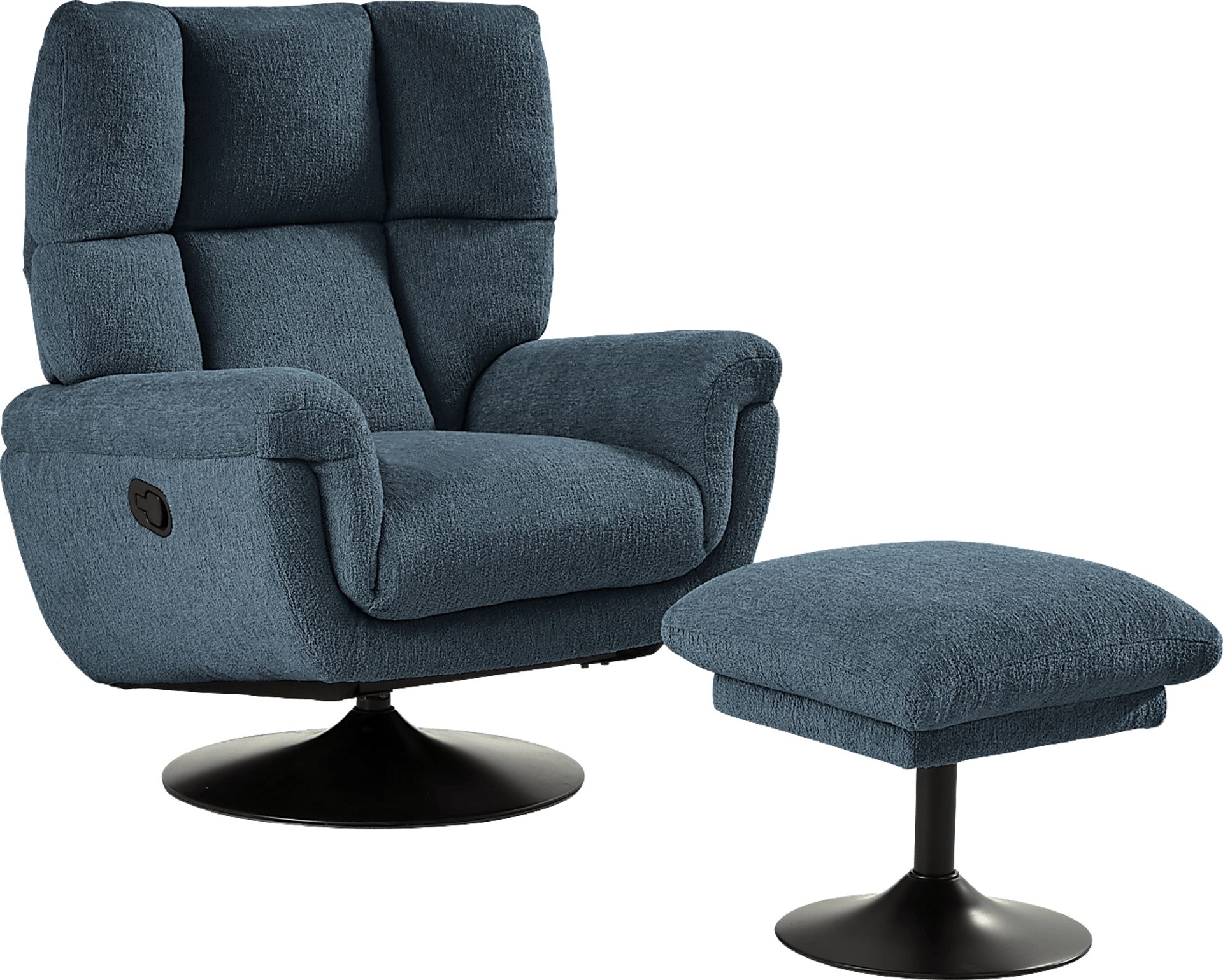 As charming and inviting as they are functional, the Braselton swivel recliner and ottoman make it easy to add a pop of style and an exceptionally comfortable seat to your room. This transitional pushback recliner can be set at any angle you choose for the ideal comfort setting, while the ratcheting headrest can be adjusted as well for extra support. The squared, chambered upholstery and matching ottoman in blue create a relaxed and inviting look, and they surround users in plush comfort on all sides. A swivel function gives the recliner a full 360 degrees of motion. Upholstery: 100% Polyester