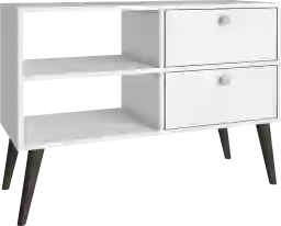 The Brawner white console will fit right into your living room, office, or bedroom. Made of high quality MDP. Its unique design includes splayed legs and square knobs. Perfect to use as a decorative piece and display collector items, books, pictures and more. The Brawner includes 2 drawers and 2 open shelves. Customer assembly is required.