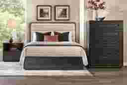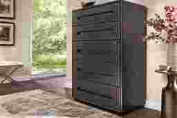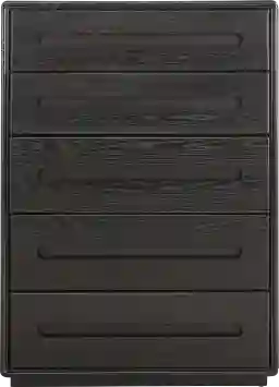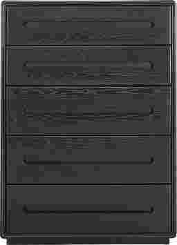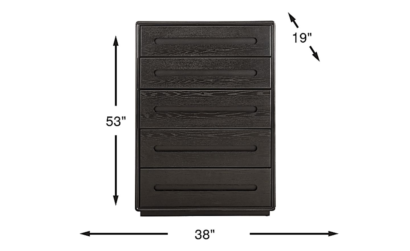 A softly lit, suite-like glow settles in as the Braxton collection brings modern calm and effortless functionality to your nightly routine. Grounded by clean lines, a plinth base and softly eased edges, this contemporary chest comes in a rich espresso finish that boasts an organic wood-like grain. Five drawers, crafted with French dovetail fronts and English backs, glides on side-mounted extension guides for everyday ease. Unique finger pull alcoves adds a sleek decorative touch.