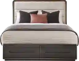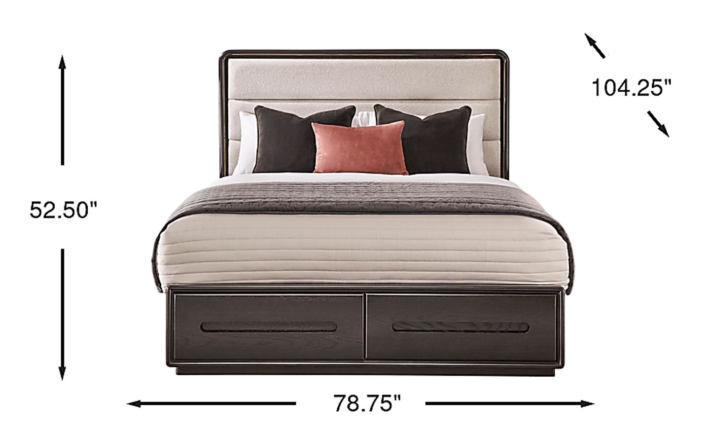 A softly lit, suite-like glow settles in as the Braxton collection brings modern calm and effortless functionality to your nightly routine. Grounded by clean lines, a plinth base and softly eased edges, this contemporary bed comes in a rich espresso finish that boasts an organic wood-like grain. The beige upholstered headboard with horizontal paneling is framed by LED lighting, while the footboard adds convenient built-in storage with two drawers. Unique finger pull alcoves add a sleek final touch to the ensemble.
