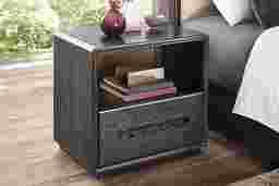 A softly lit, suite-like glow settles in as the Braxton collection brings modern calm and effortless functionality to your nightly routine. Grounded by clean lines, a plinth base and softly eased edges, this contemporary nightstand comes in a rich espresso finish that boasts an organic wood-like grain. The single-drawer, crafted with French dovetail fronts and English backs, glides on side-mounted extension guides for everyday ease. Mounted to the back, USB/USB-C charging offers convenient power to your devices. The open top shelf with LED lighting provides perfect display space, while the unique finger pull alcove adds a sleek decorative touch.