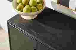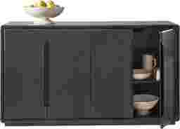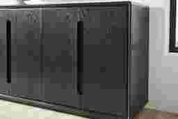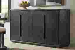 This server stands out for its softly rounded frame and sculptural silhouette, which brings a refined, modern edge to any room. Instead of traditional protruding hardware, it features oversized vertical pulls integrated directly into the door fronts. This architectural detail creates a clean, uninterrupted look while ensuring the doors are easy and intuitive to open, making it a perfect anchor for a contemporary dining space.