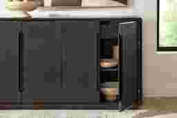 The room stays beautifully composed and effortlessly refined with the Braxton collection, setting the stage with sculptural silhouettes and crisp contrast. Crafted with oak veneers in an espresso black finish, this contemporary server features four flat-panel doors set within a softly rounded frame for a refined, modern silhouette. Oversized vertical pulls are integrated into the door fronts for a clean, sculptural look while keeping function easy and intuitive. Behind the doors, generous interior storage keeps entertaining essentials neatly tucked away, while a convenient outlet provides power for small kitchen appliances or lighting.