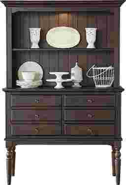 Show off your china or collectibles in the spacious, multi-functional Braywood china cabinet. Three drawers on the right side of the bottom server combine with a faux front door on the left side (where an adjustable shelf is located) for plenty of space to tuck linens or silverware out of sight. Wood-trimmed glass shelves in the upper hutch portion feature an overhead LED light, which is accessible on the side. Constructed from wood solids, light weathering details accent the warm antiqued cherry over oak grain finish.