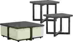 The refined character of minimalistic design in the Bremen table collection is embodied in each detail, from its clean lines to its natural textures. Crafted from oak veneers in a charcoal black finish, this table set features a square cocktail table and two end tables that offer contemporary style and a beautifully wood-grain-like surface. Four beige upholstered ottomans slide smoothly from the cocktail table's intercrossed base on casters, providing flexible seating, additional tabletop space, or a comfortable footrest. Upholstery: 100% polyester.
