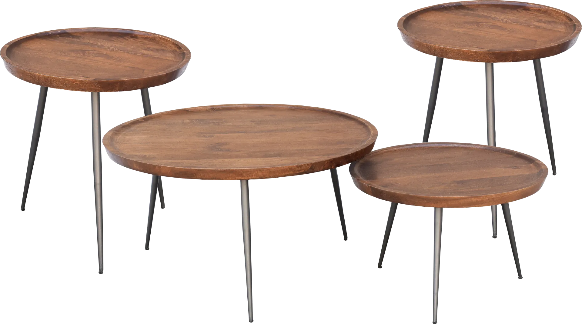 Bring contemporary and industrial flair to your living space with the Brendleton table set. 35-inch and 24-inch cocktail tables combine with two end tables to give you plenty of room for resting drinks or snacks while you host friends and family. The wooden tabletops come in a natural brown finish, while metal bases provide sturdy support. Customer assembly may be required.