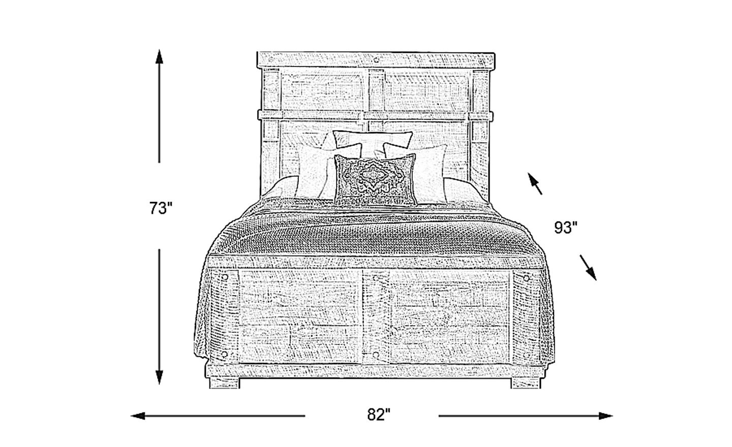 With substantial dimensions of 82"W x 93"D and a tall 73" headboard, this king bed is a statement piece best suited for rooms that are at least 12' x 14'. For a comfortable layout, we recommend maintaining at least 30 to 36 inches of clearance around the sides and footboard to ensure easy movement and space for additional bedroom storage pieces.