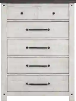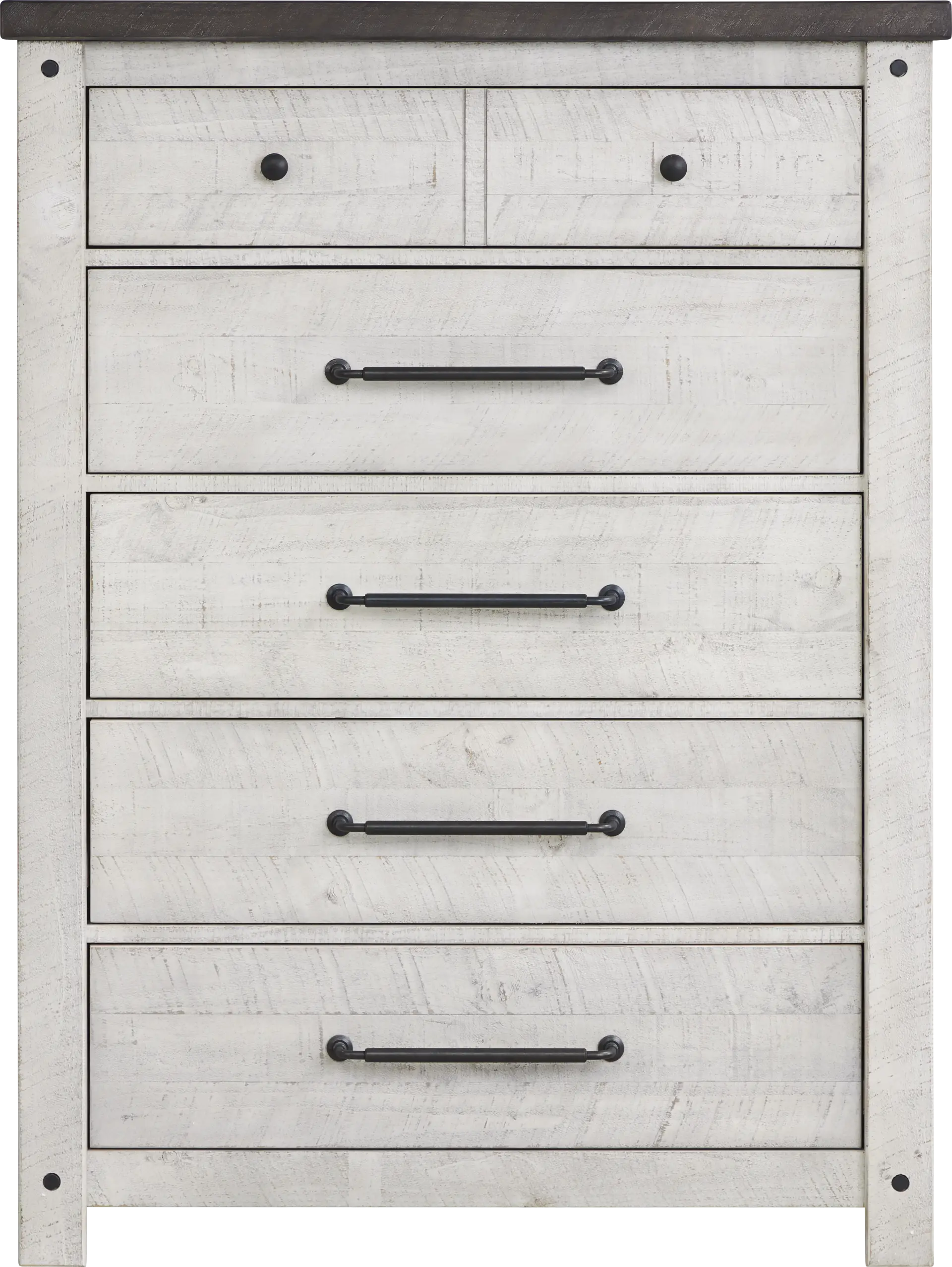 The simple elegance of the Bretten Crossing chest adds a rustic and refined style. Featuring five drawers with gray metal pulls and dustproof bottoms, each is crafted with French dovetail joints in the front, English dovetail joints in the back and full extension ball bearing glides to ensure strength and longevity.