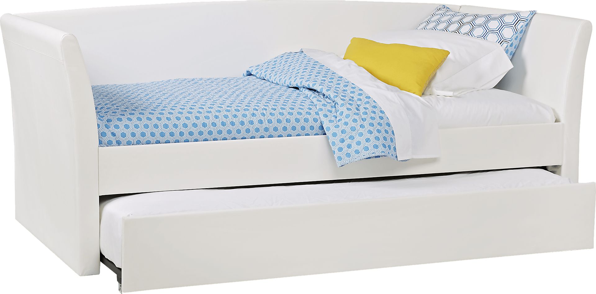 Turn your home office, or any other room, into a guest room with the space saving Brianne daybed. It is upholstered in classic white UltraHyde for a rich leather look. The slide out trundle drawer is ideal for an extra mattress that doubles the sleeping space (mattress not included). An 8" mattress is recommended for the trundle. Mattress and bedding not included.