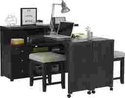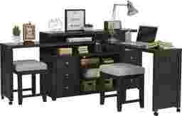 A complete space-saving solution, the Briar Hill wall unit has everything you want in an entertainment room and office. The 56-inch console sits neatly under a swivel table that rotates outward on each side, instantly creating a home workspace. Two upholstered stools, included, fit perfectly between the table and console to be used whenever needed. For abundant storage, the console features six drawers and an open cubby with two shelves. Caster wheels on both ends of the swivel table ensure a seamless transition from console to desk. Plus, a third level above the table makes an ideal surface for displaying a television or work of art. This wall unit's dark merlot finish emphasizes a classic, timeless style.