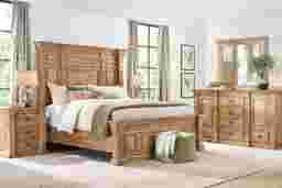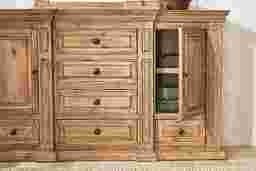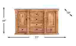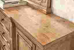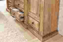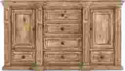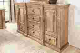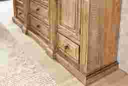 Quiet countryside mornings, the soft glow of light and texture gathering in gentle harmony... these are the hallmarks of Briar Hill, where every detail is richly observed with enduring charm. Rooted in traditional style, this dresser is finished in a soft natural tone that highlights its framed molding, stepped edges, and pilastered corners. Organizing everything from tees to sweaters, the unique storage setup offers four center drawers flanked by a cabinet door and bottom drawer on each side. A sturdy plinth base grounds the piece, while dark metal knobs add a classic touch.
