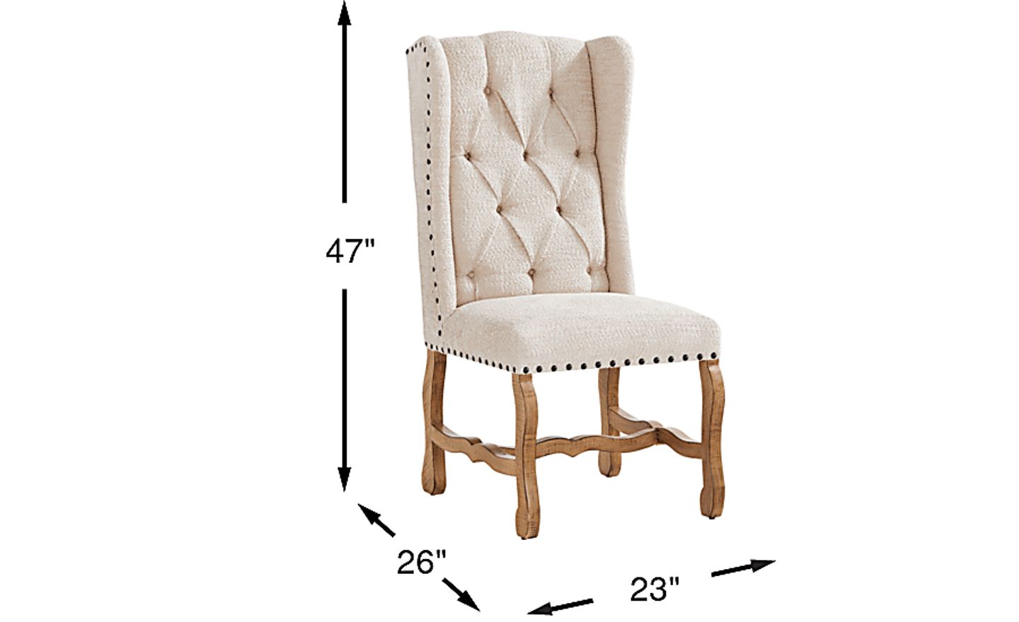 Quiet countryside mornings, the soft glow of light and texture gathering in gentle harmony... these are the hallmarks of Briar Hill, where every detail is richly observed with enduring charm. Rooted in traditional style, this side chair is upholstered in soft beige fabric and accented with a stylish nailhead trim. The high wingback showcases diamond tufting for an elegant touch, while wavy legs finished in a soft natural tone bring a casual ease.