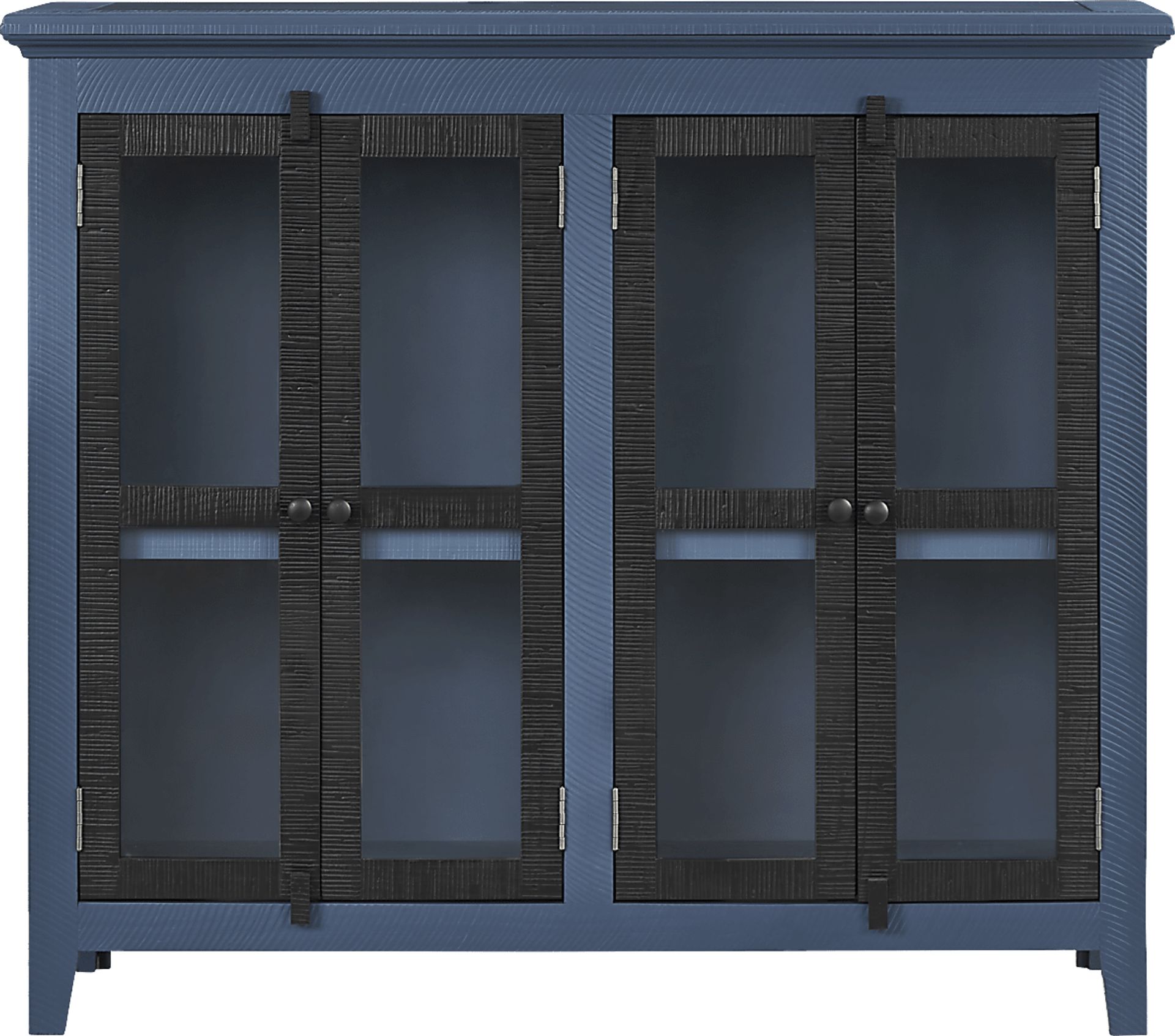 Mixing materials for a bold look with depth and sophistication, the Bridgeport accent cabinet's visual impact is elevated through its contrasting metal doors against a wooden frame. Contemporary in style and constructed of pine and poplar wood solids, this piece features four glass doors with adjustable shelves to provide ample space for storing and showcasing your décor.
