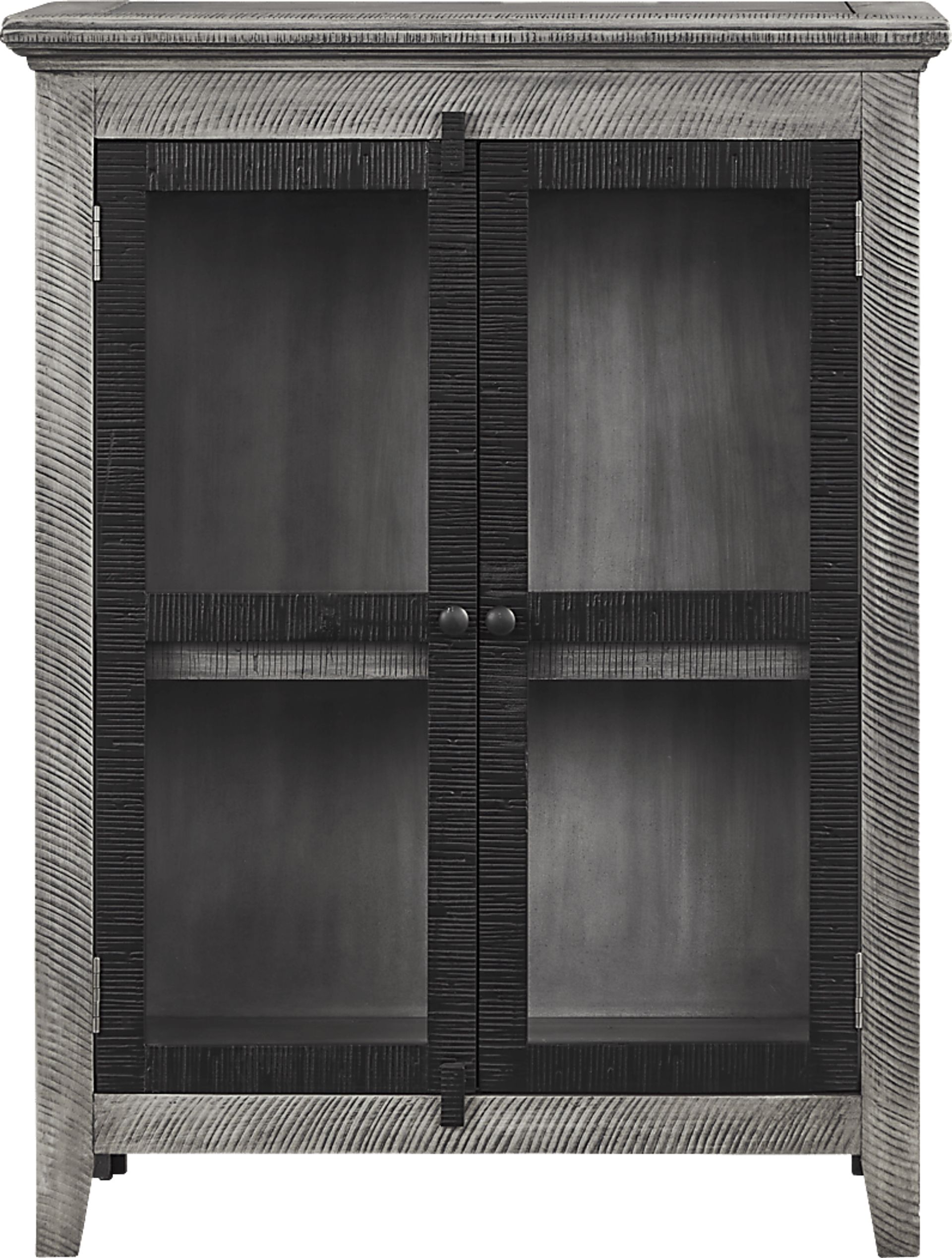 Mixing materials for a bold look with depth and sophistication, the Bridgeport accent cabinet's visual impact is elevated through its contrasting metal doors against a wooden frame. Contemporary in style and constructed of pine and poplar wood solids, this piece features two glass doors with adjustable shelves to provide ample space for storing and showcasing your décor.