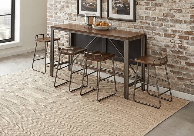 Featuring a simple and clean look, the Bridgetown flip top dining table transforms your dining space into a customizable area that can fit any need. The folding leaf allows the table to double in size from 20 inches to 40 inches, creating space for all your friends and family to gather. A wood top with pine veneers in a brown finish and the black iron base add an industrial influence.