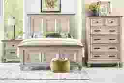 The comforting warmth of nostalgia with an invigoratingly fresh style in the Bridgewood bedroom delivers an idyllic nightly relaxation retreat. This traditional collection sets the atmosphere with handsome panel accents on the headboard and footboard and a weathered cream finish throughout. Metal knobs and pulls on each matching piece add substantial texture to storage drawers while bold pyramid feet contribute to the room's fashionable flair. The nightstand has USB and USB-C charging ports on the back for total convenience, and the bottom drawer of the chest features dust-proofing for extended storage. Mattress and foundation (if required) sold separately. Bed shown is queen size.