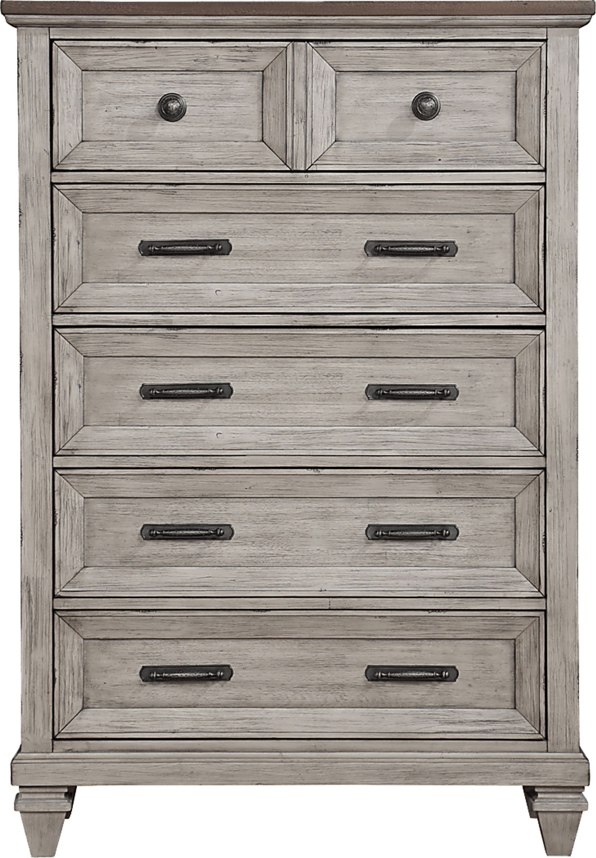 The comforting warmth of nostalgia with an invigoratingly fresh style in the Bridgewood chest brings something special to an idyllic nightly relaxation retreat. This traditional piece sets the atmosphere with handsome panel accents on the front and a weathered cream finish throughout. Metal knobs and pulls add substantial texture to storage drawers while bold pyramid feet contribute to your room's fashionable flair. The bottom drawers feature dust-proofing for extended storage.
