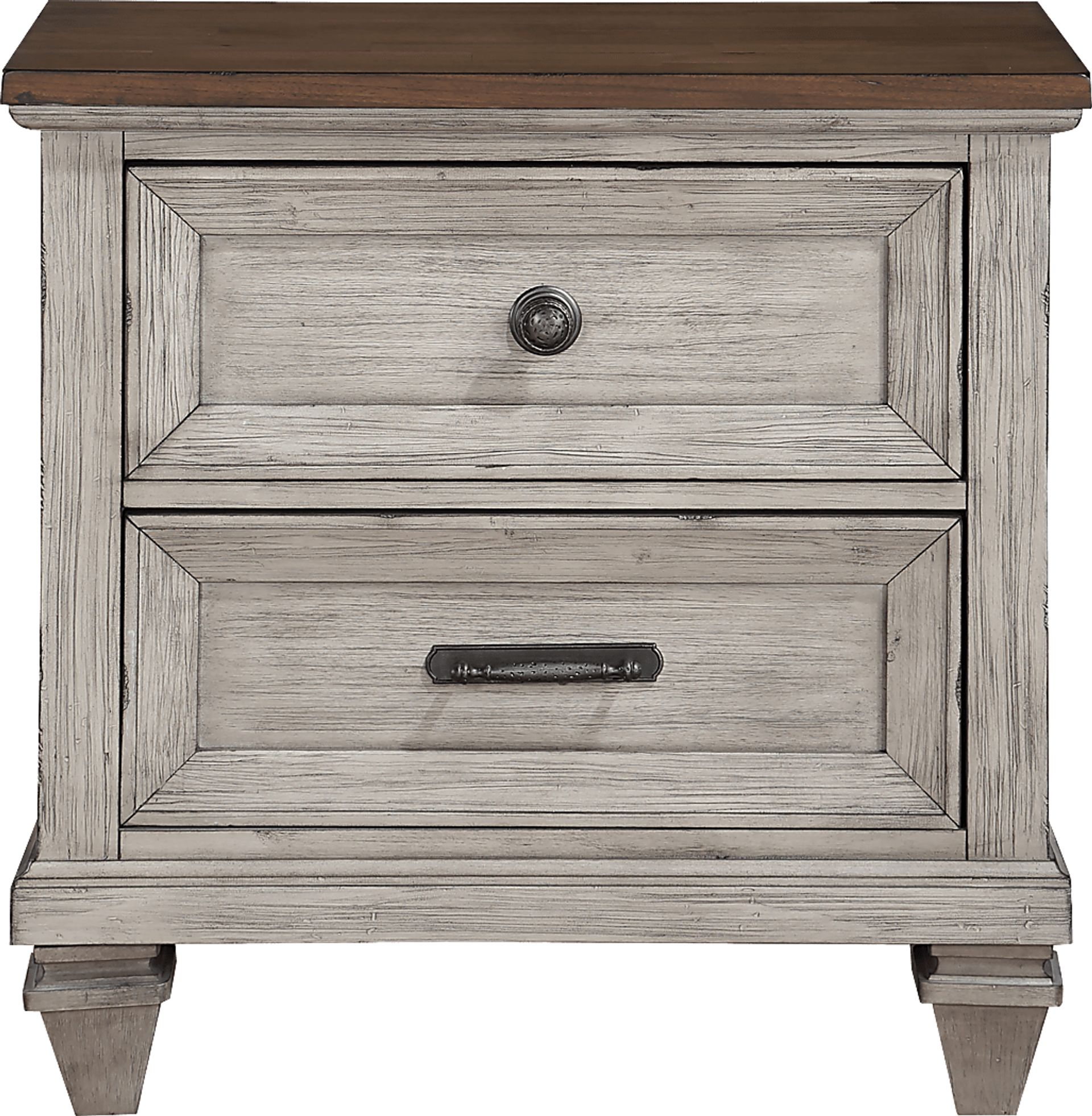 The comforting warmth of nostalgia with an invigoratingly fresh style in the Bridgewood nightstand brings something special to an idyllic nightly relaxation retreat. This traditional piece sets the atmosphere with handsome panel accents on the front and a weathered cream finish throughout. A metal knob and pull add substantial texture to storage drawers while bold pyramid feet contribute to your room's fashionable flair. USB and USB-C charging ports are concealed on the back of this piece for added convenience.