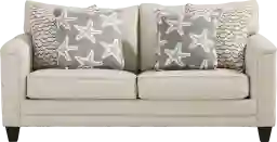 Yes, this sofa includes color-coordinated, ocean-inspired toss pillows. These accents are specifically curated to enhance the coastal-transitional aesthetic of the collection, providing a professionally styled look that adds both a gentle touch of color and extra lumbar support to the piece.