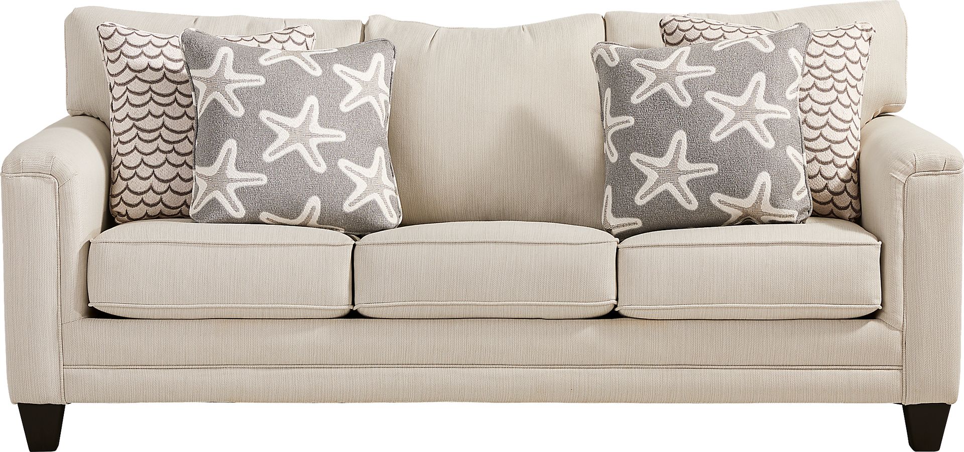 The ease of coastal living melting away life's stresses comes to life in the Brightwater collection's soothing blend of calming hues, flowing lines, and effortless versatility. Transitional in style, this sofa is upholstered in woven sandy beige fabric that infuses your space with a light and tranquil ambiance. Padded track arms and welted seams throughout add tailored charm and supportive comfort. Loose back and seat cushions offer a cloud-like experience. Ocean-inspired accent pillows add a gentle touch of style, while black tapered legs provide a refined touch to perfectly round off the ensemble. Upholstery: 60% polyester, 40% polypropylene.
