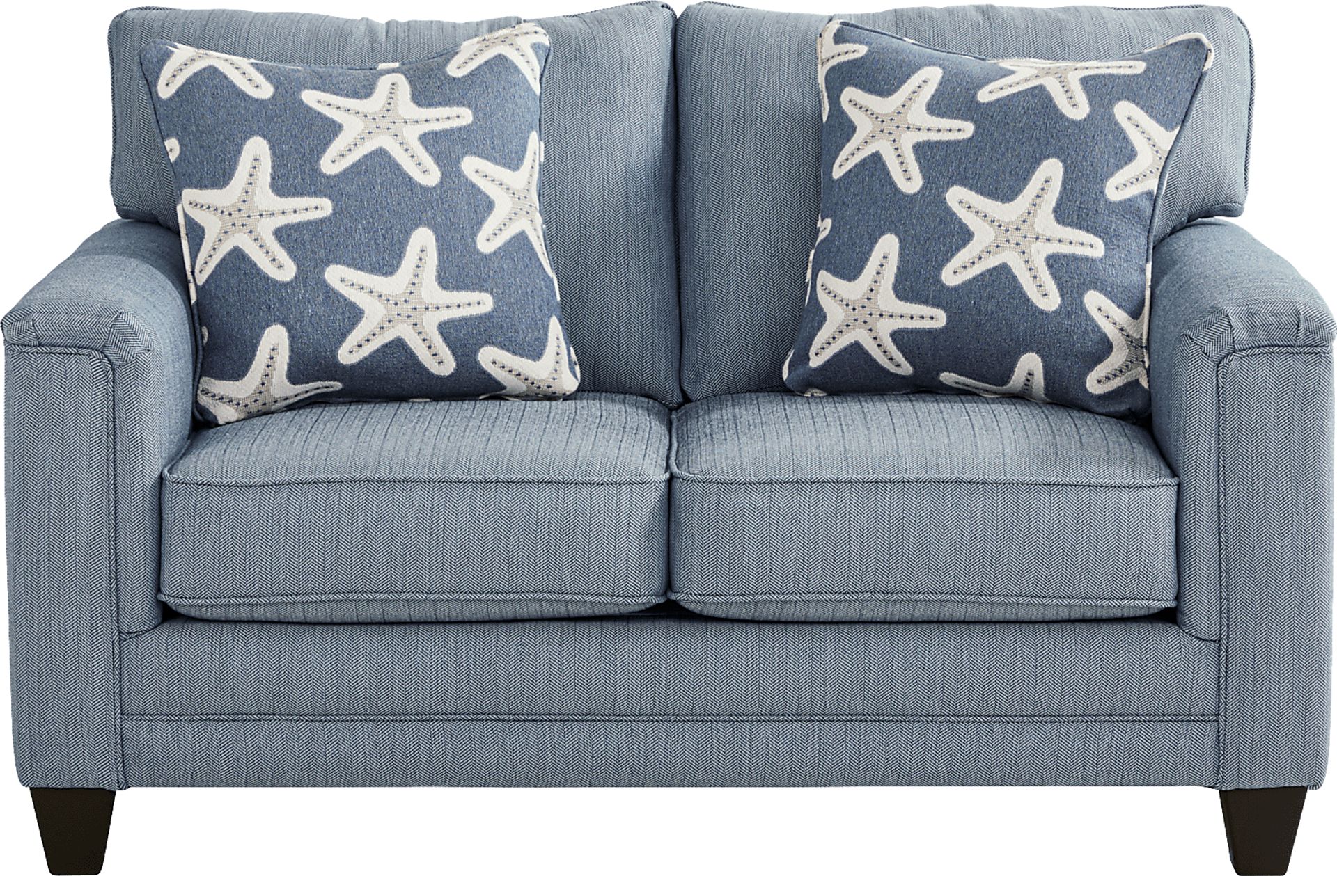 The ease of coastal living melting away life's stresses comes to life in the Brightwater collection's soothing blend of calming hues, flowing lines, and effortless versatility. Transitional in style, this loveseat is upholstered in woven marine gray fabric that infuses your space with a light and tranquil ambiance. Padded track arms and welted seams throughout add tailored charm and supportive comfort. Loose back and seat cushions offer a cloud-like experience. Ocean-inspired accent pillows add a gentle touch of style, while black tapered legs provide a refined touch to perfectly round off the ensemble. Upholstery: 60% polyester, 40% polypropylene.