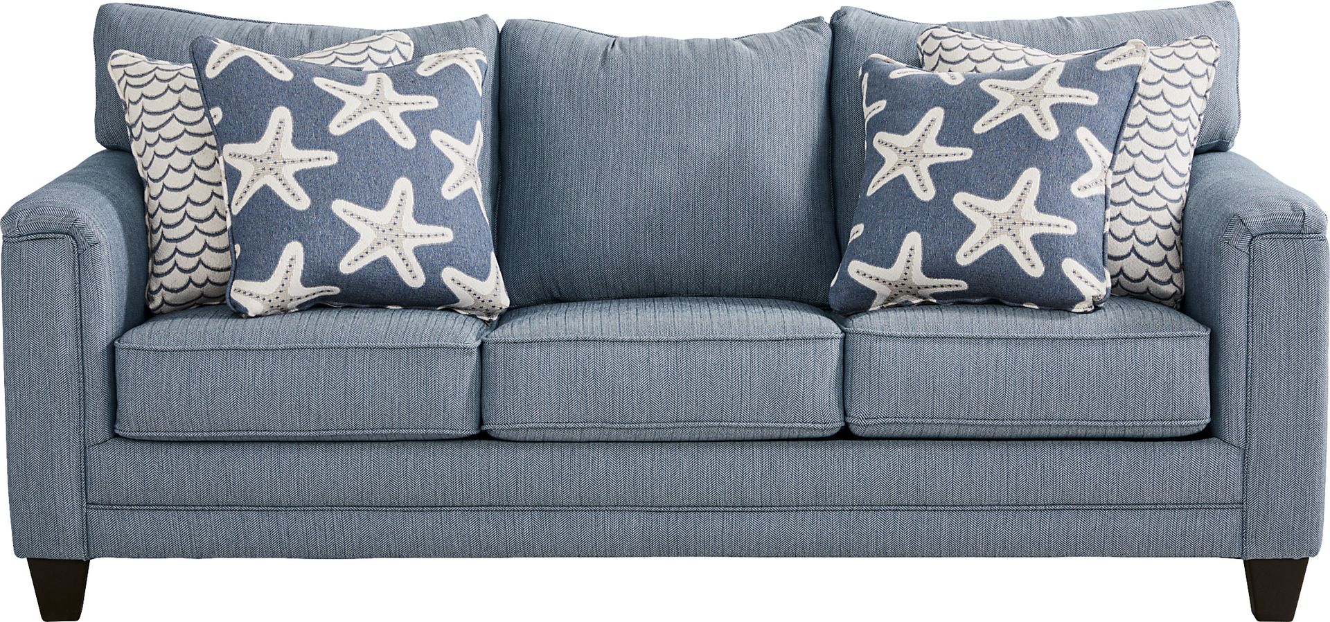 The ease of coastal living melting away life's stresses comes to life in the Brightwater collection's soothing blend of calming hues, flowing lines, and effortless versatility. Transitional in style, this sofa is upholstered in woven marine gray fabric that infuses your space with a light and tranquil ambiance. Padded track arms and welted seams throughout add tailored charm and supportive comfort. Loose back and seat cushions offer a cloud-like experience. Ocean-inspired accent pillows add a gentle touch of style, while black tapered legs provide a refined touch to perfectly round off the ensemble. Upholstery: 60% polyester, 40% polypropylene.