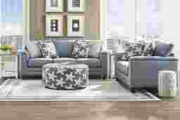 The ease of coastal living melting away life's stresses comes to life in the Brightwater collection's soothing blend of calming hues, flowing lines, and effortless versatility. Transitional in style, this sofa is upholstered in woven marine gray fabric that infuses your space with a light and tranquil ambiance. Padded track arms and welted seams throughout add tailored charm and supportive comfort. Loose back and seat cushions offer a cloud-like experience. Ocean-inspired accent pillows add a gentle touch of style, while black tapered legs provide a refined touch to perfectly round off the ensemble. Upholstery: 60% polyester, 40% polypropylene.