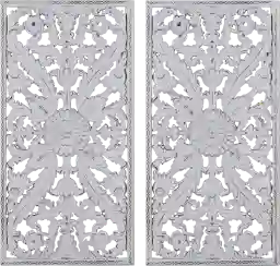 Complete your home decor with our Madison Park Botanical Panel Distressed Carved Wood 2-piece Wall Decor Set. This wall decor set features exquisite carved global botanical designs in a durable MDF material creating beautiful texture and dimension, while a white washed finish adds a unique vintage touch. Each piece is finished with two D-rings on the reverse making it easy to hang pieces, either side by side for a more clean look or staggered for a more stylized approach. Perfect for any Living Room, Dining Room, or Entry way - this carved wood panel 2 piece set is the perfect elegant touch to any decor.
