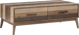 This table features two practical storage drawers equipped with extended drawer glides. These specialized glides allow the drawers to open fully and smoothly, providing easy access to the very back of the drawer—ideal for stashing remote controls, coasters, or magazines. The sleek metal hardware adds a refined, durable touch to the rustic design.