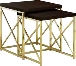 With rich cappuccino square table tops and a stylish thick paneled design, this set of 2 Brillock nesting tables gives an exceptional look to any room. The stylish criss-cross gold metal base provides sturdy support as well as a clean, contemporary look. Use this multi-functional set as end tables, lamp tables, decorative display tables, or simply as accent pieces for any living space. Customer assembly is required.